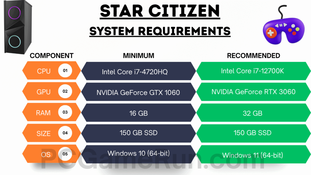 The game requires an Intel Core i7-4720HQ or AMD Ryzen 5 2600X and 16 GB of RAM to run the game at low visual effects. The other specs should be 150 GB of SSD hard drive space, Windows 10 latest build 64-bit, and DirectX 11 as well. One of the most highly valued requirements is graphics, which should meet NVIDIA GeForce GTX 1060 or AMD RX 5600 XT to run it. You have to keep in mind that these specs are too high to play other games like GTA V and Forza Horizon 5. But for Star Citizen, these are the lowest required specs to play it.